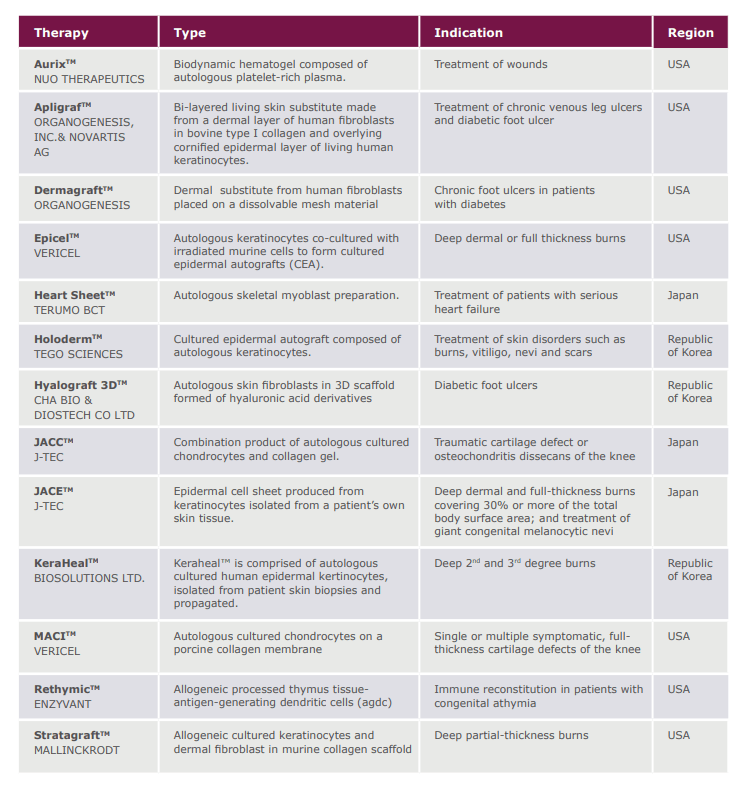 While ATS, didn’t reignite to see another day, Organogenesis, after a few transactional deals, revived and lives today, ironically enough with the assets of ATS(Dermagraft) inside of it as well. Organogenesis is one of handful of companies that ships products with living cells. The Alliance for Regenerative Medicine created a recent white paper that lists the majority of companies’ products with cells being approved are to regenerate skin or cartilage. (List below)