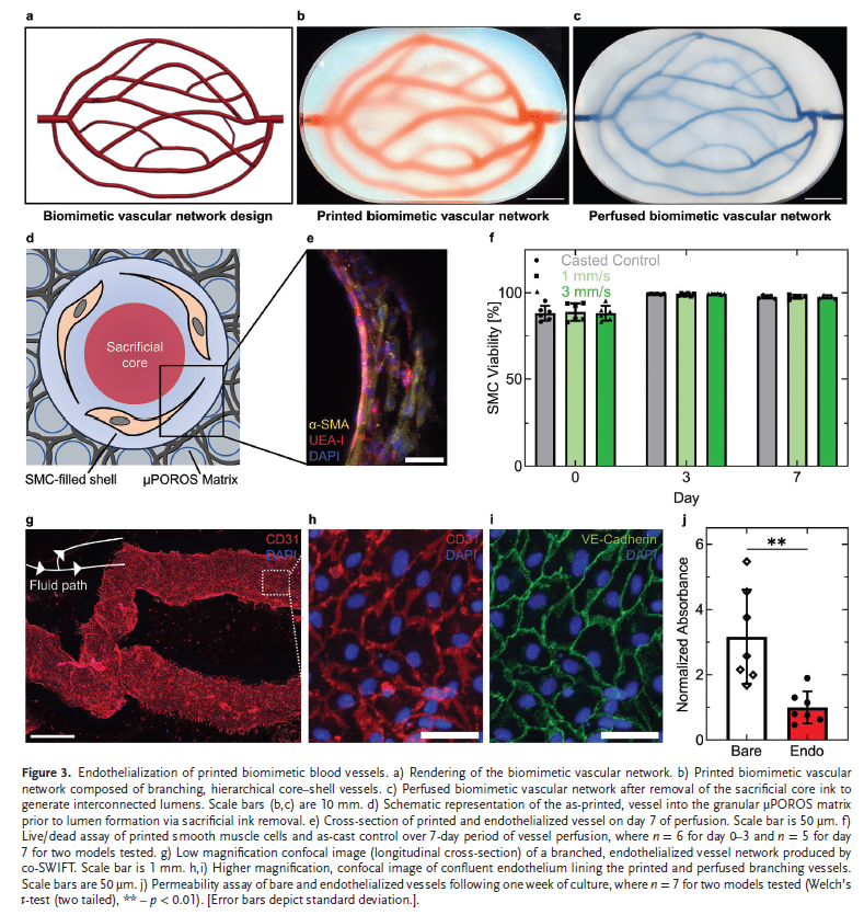 To demonstrate the versatility of the co-SWIFT method, the researchers embedded biomimetic vascular networks within an extracellular matrix composed of μPOROS collagen. This matrix was created by suspending sacrificial gelatin-chitosan microparticles in a prepolymer collagen solution. The embedded vascular networks were patterned to conform to Murray’s law, ensuring physiological relevance. Upon printing, the sacrificial core was removed, and the luminal surfaces were seeded with endothelial cells, creating functional vessels with good barrier function.