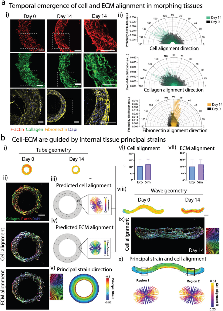 - Shape-Morphing Driven by Cells: The study shows that cells—particularly cardiac fibroblasts and induced pluripotent stem cell-derived cardiomyocytes (iPSC-CMs)—generate forces that shrink and reshape the bioprinted tissue. Over time, these forces align the cells and ECM along the tissue’s principal axis, mimicking the anisotropic architecture found in native heart tissue.