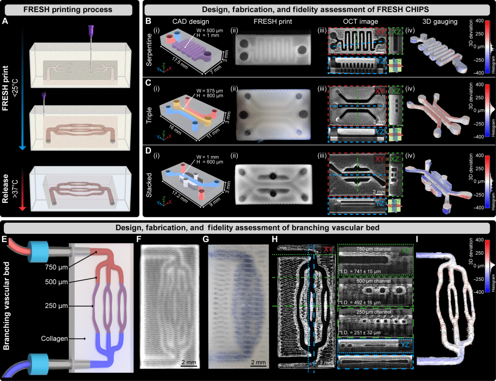 Figure from paper: Fabrication, 3D gauging, and perfusion of FRESH-printed CHIPS.